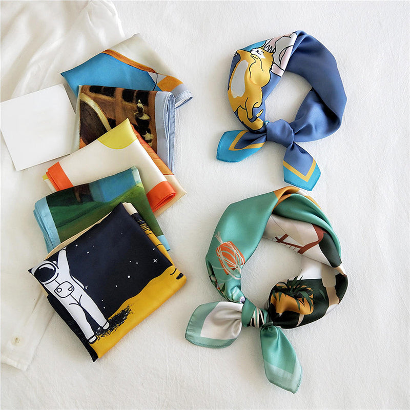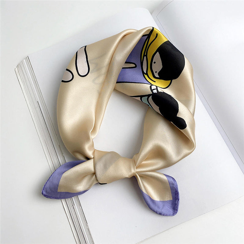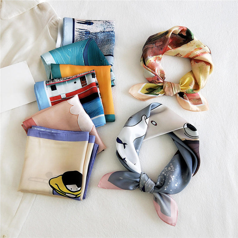 This scarf draws inspiration from designer figures and sailing motifs, blending modern artistry with classic elegance to deliver a distinctive luxurious aesthetic. Crafted from premium polyester fiber, it offers a silky-smooth, lightweight feel with a natural sheen and silk-like texture. Its graceful drape ensures skin-friendly comfort. Its square, cropped design offers versatile styling possibilities—wear it as a neck scarf, headband, hair accessory, equestrian scarf, or mini shawl to complement diverse outfits.