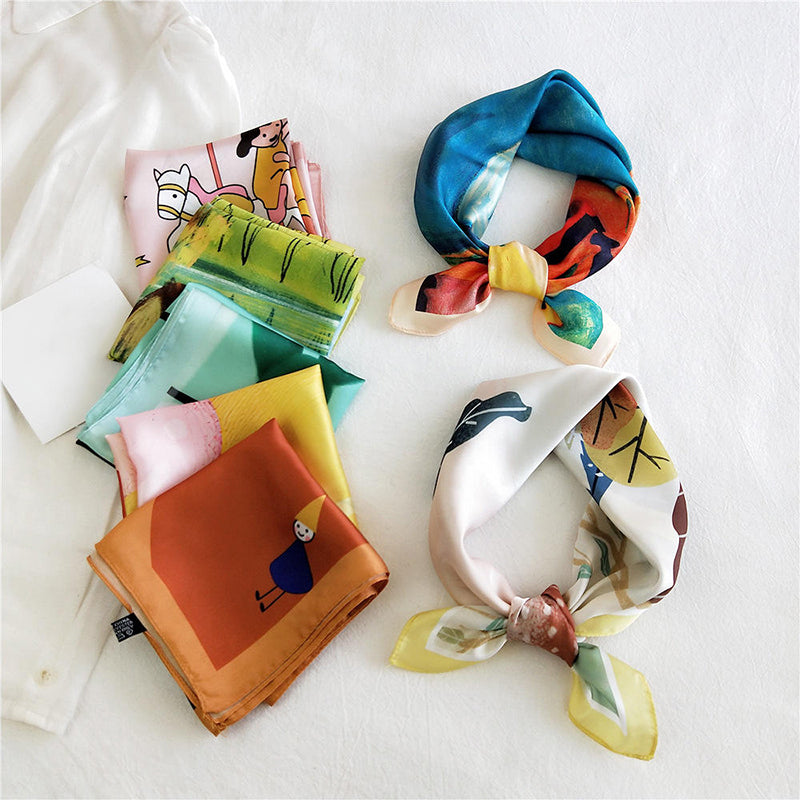 This scarf draws inspiration from adorable kittens and color-blocked landscape prints, blending cartoon charm with artistic elements to create a uniquely playful yet fashionable visual effect. Crafted from high-quality polyester fiber, it offers a silky-smooth feel, lightweight breathability, and a natural silk-like sheen for skin-friendly comfort. Its square design offers versatile styling possibilities, serving as a neck scarf, headband, hair tie, equestrian scarf, or shawl to meet diverse outfit needs.